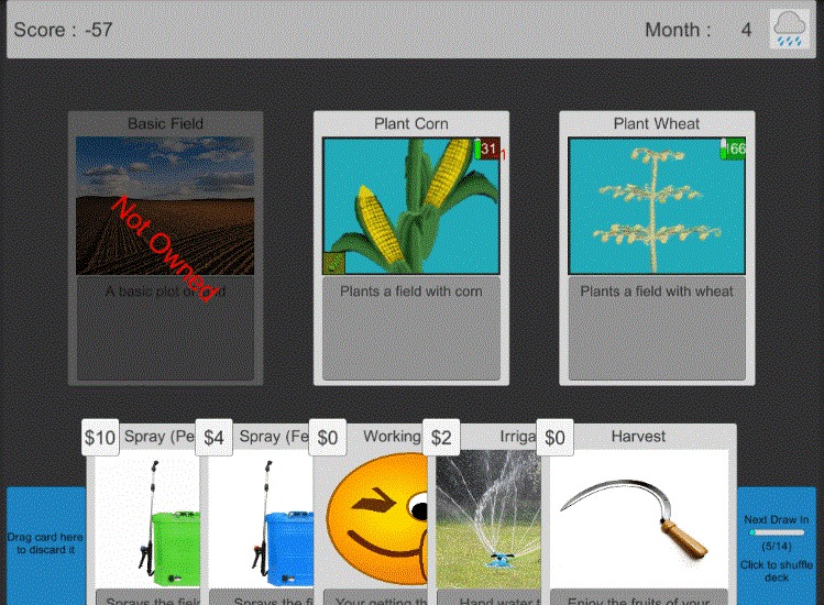Given an initial deck of cards you manage a farm (sim farm style) Throughout play you can gain new cards, plants grow, and you try to protect against insects, weeds and weather(flooding). Good luck!